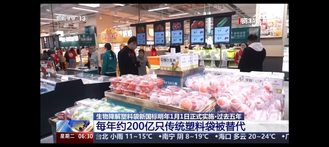 生物降解塑料袋新国标2027年1月1日正式实施,过去五年,每年约200亿只传统塑料袋被替代。