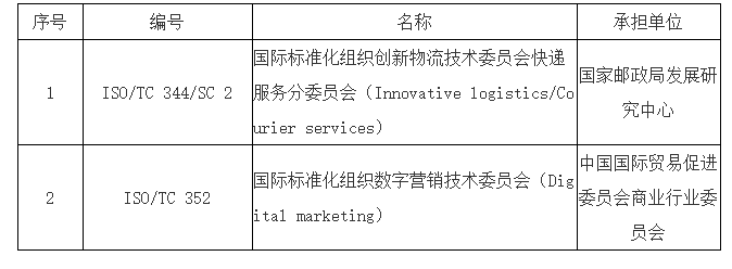 国家标准委批准国家邮政局发展研究中心等单位分别承担国际标准化组织创新物流技术委员会快递服务分委员会(ISO/ TC 344/SC 2)等2个ISO技术机构秘书处,现予以公告。